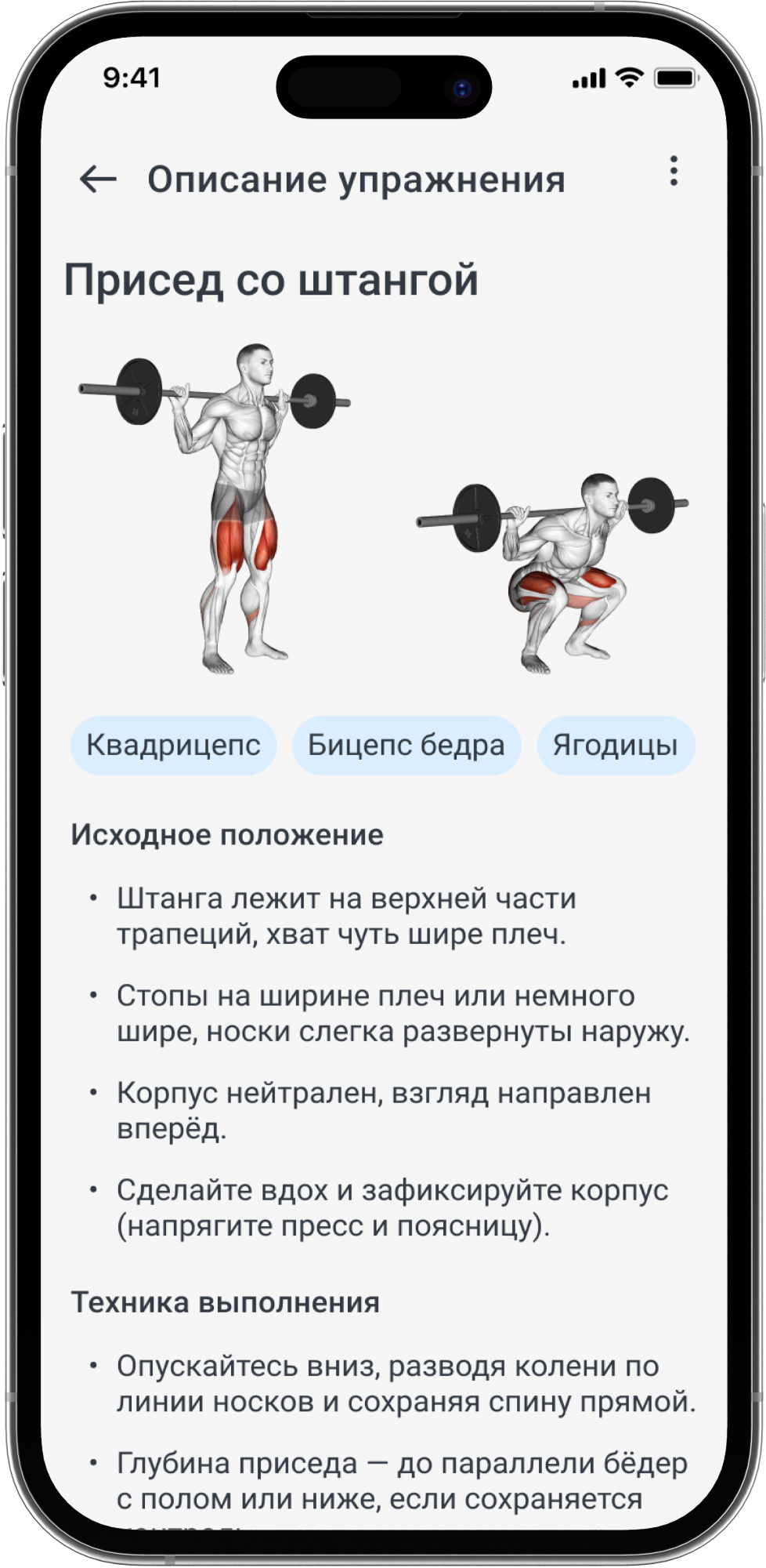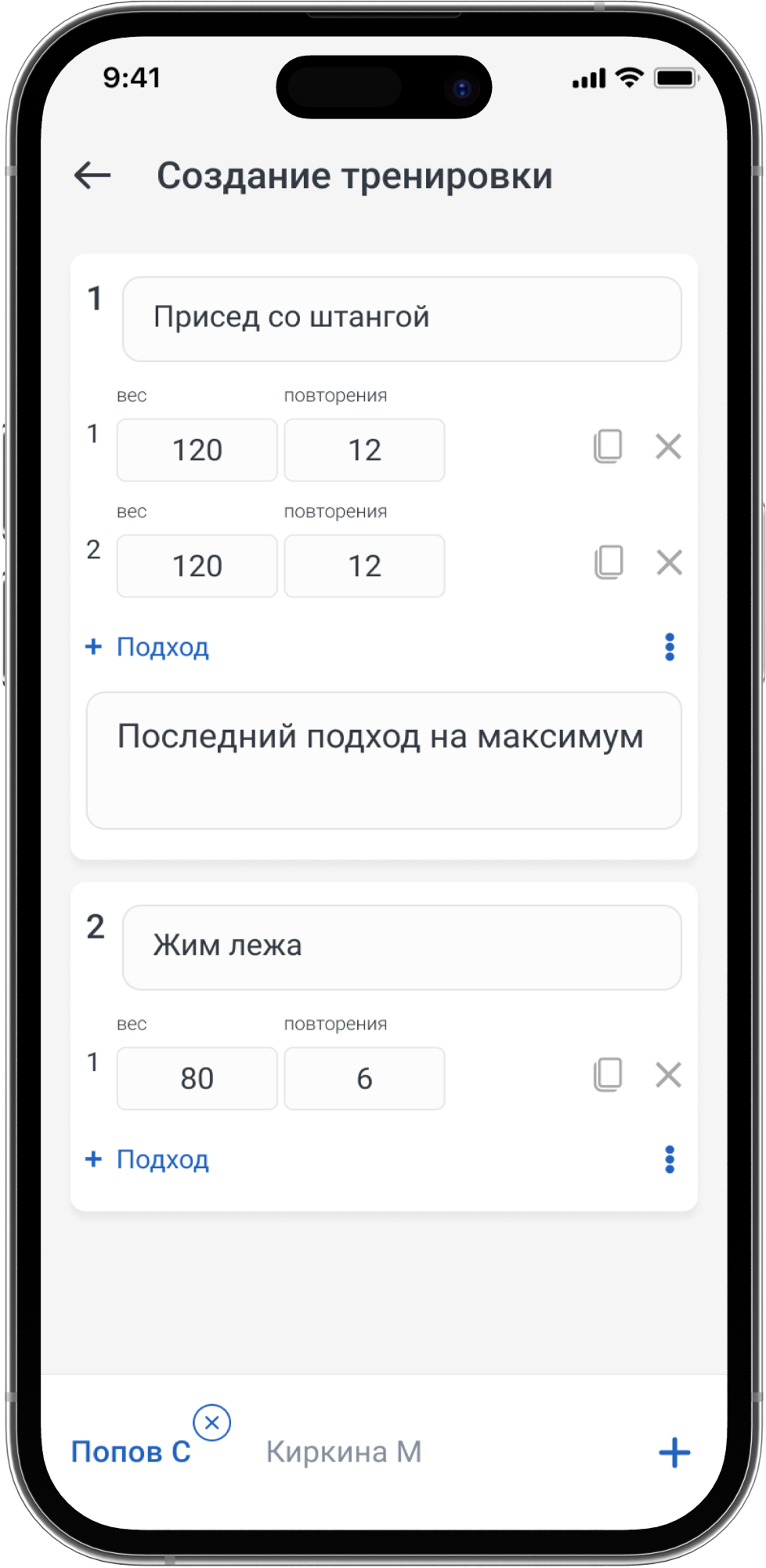 Тренируйтесь по плану и фиксируйте прогресс (веса, повторы, заметки) — история занятий доступна